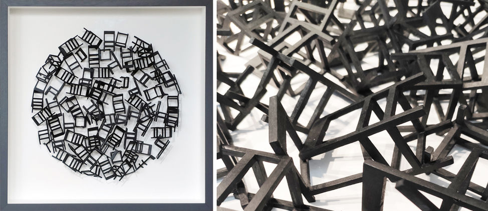 These are pieces that entertain the eye and invite the viewer to linger in the playful disappearance of the single object amongst the positive and negative space and the shadows the object's repetition produces when arranged in an organised chaos. Still, there is a clear sense of balance and order in these gatherings of a single multiplied object.